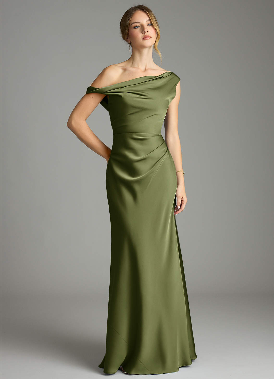 Olive Mermaid Off the Shoulder Stretch Satin Dress