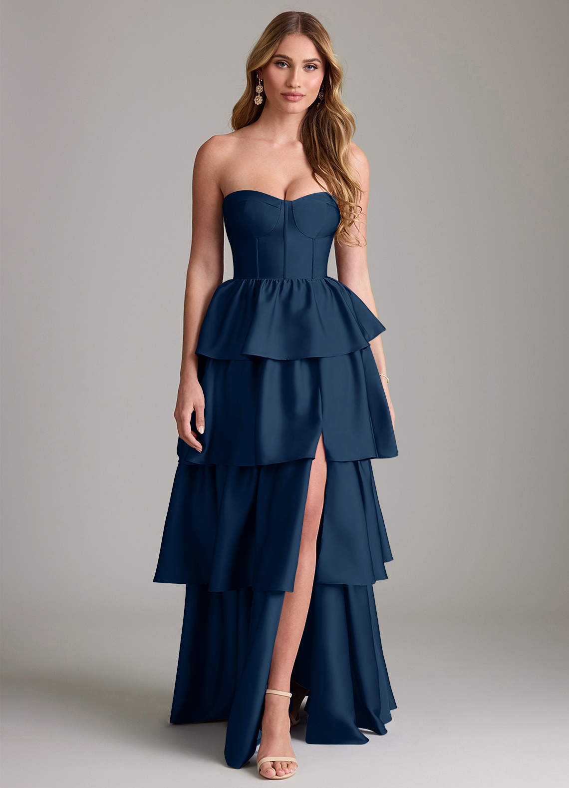 Dark Navy A-Line Ruched Stretch Satin Dress
