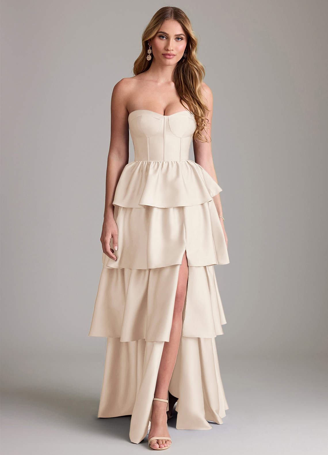 White Alabaster A-Line Ruched Stretch Satin Dress