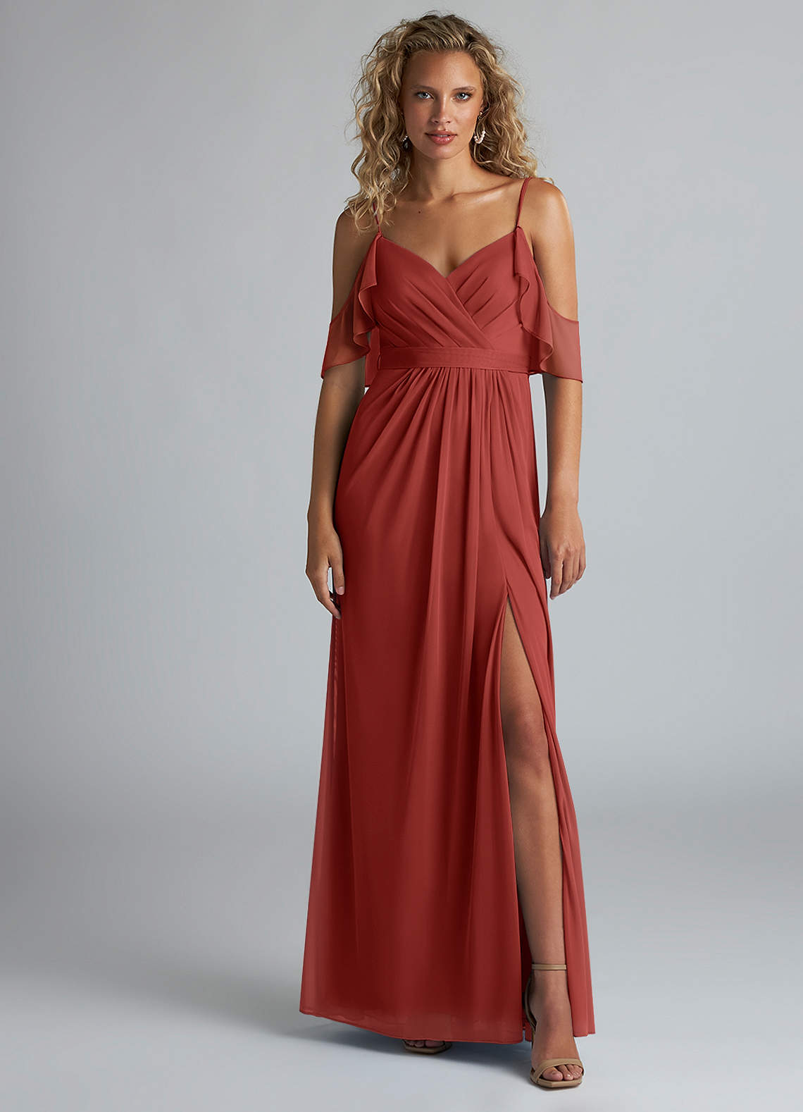 Terracotta A-Line V-neck Ruched Mesh Dress