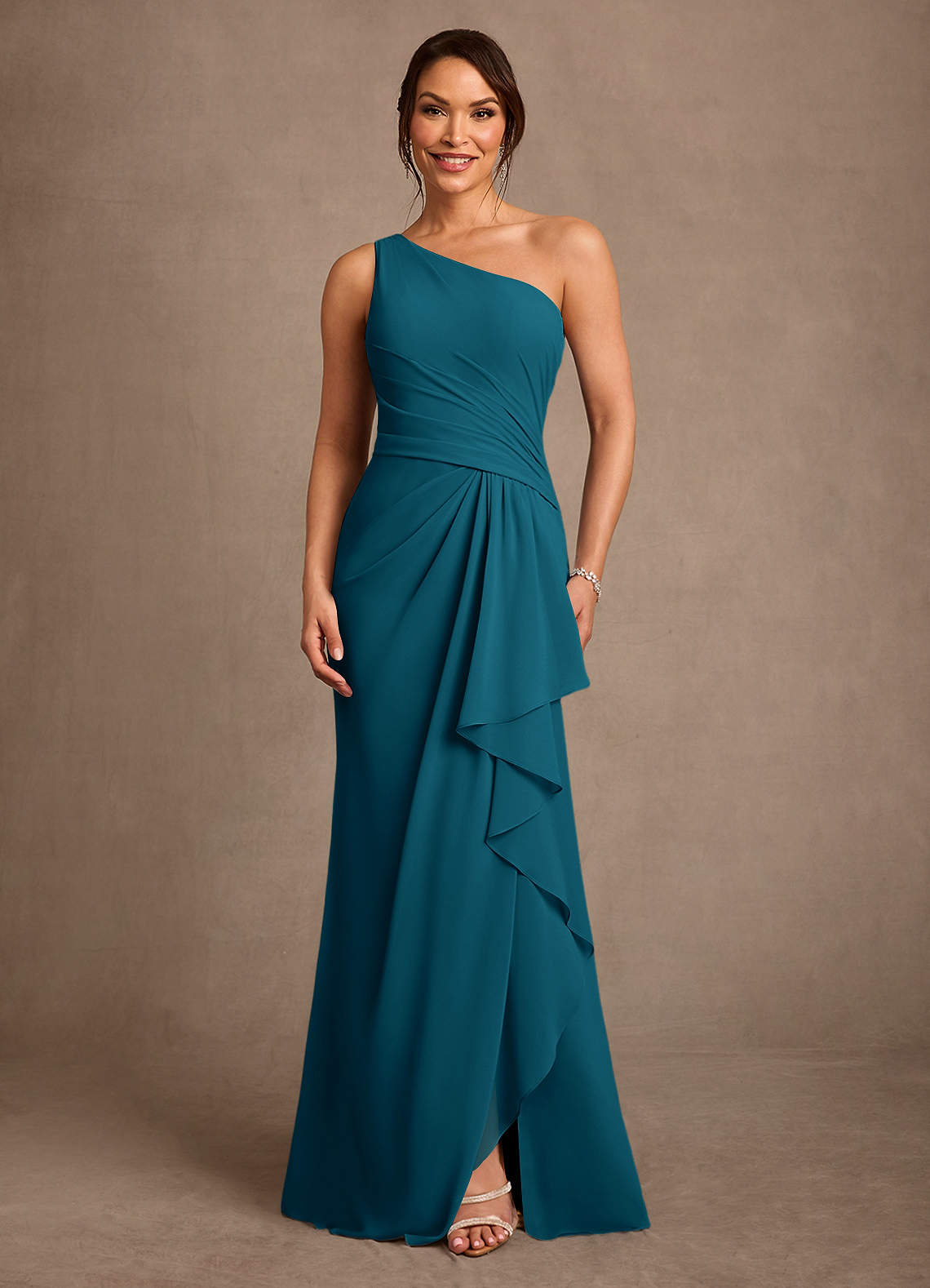 Ink Blue Sheath One Shoulder Chiffon Dress