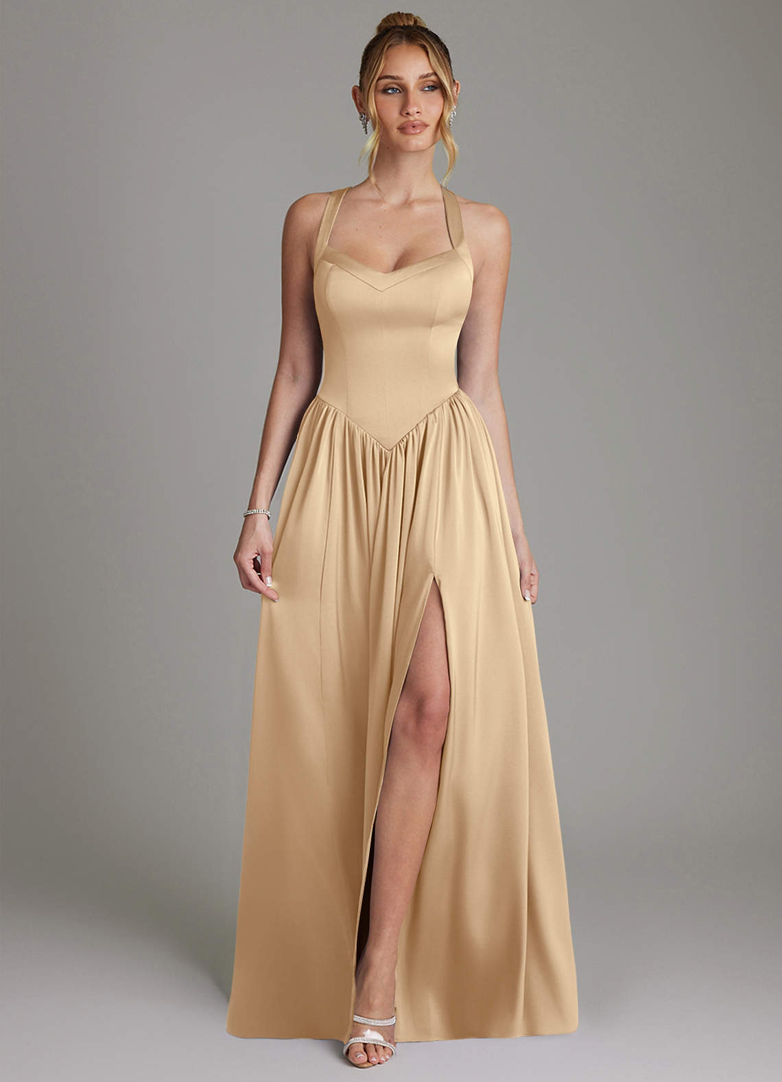 Champagne A-Line Corset Stretch Satin Dress