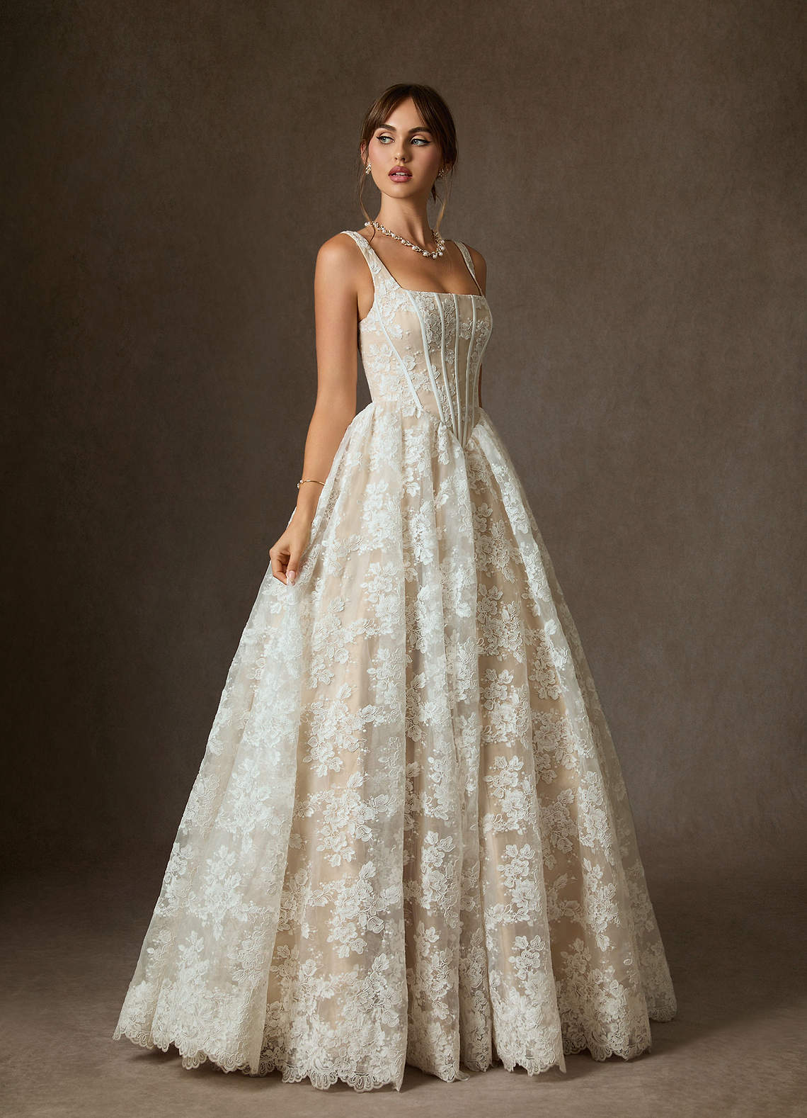 Diamond White Champagne Ball-Gown Square Neckline Lace Dress