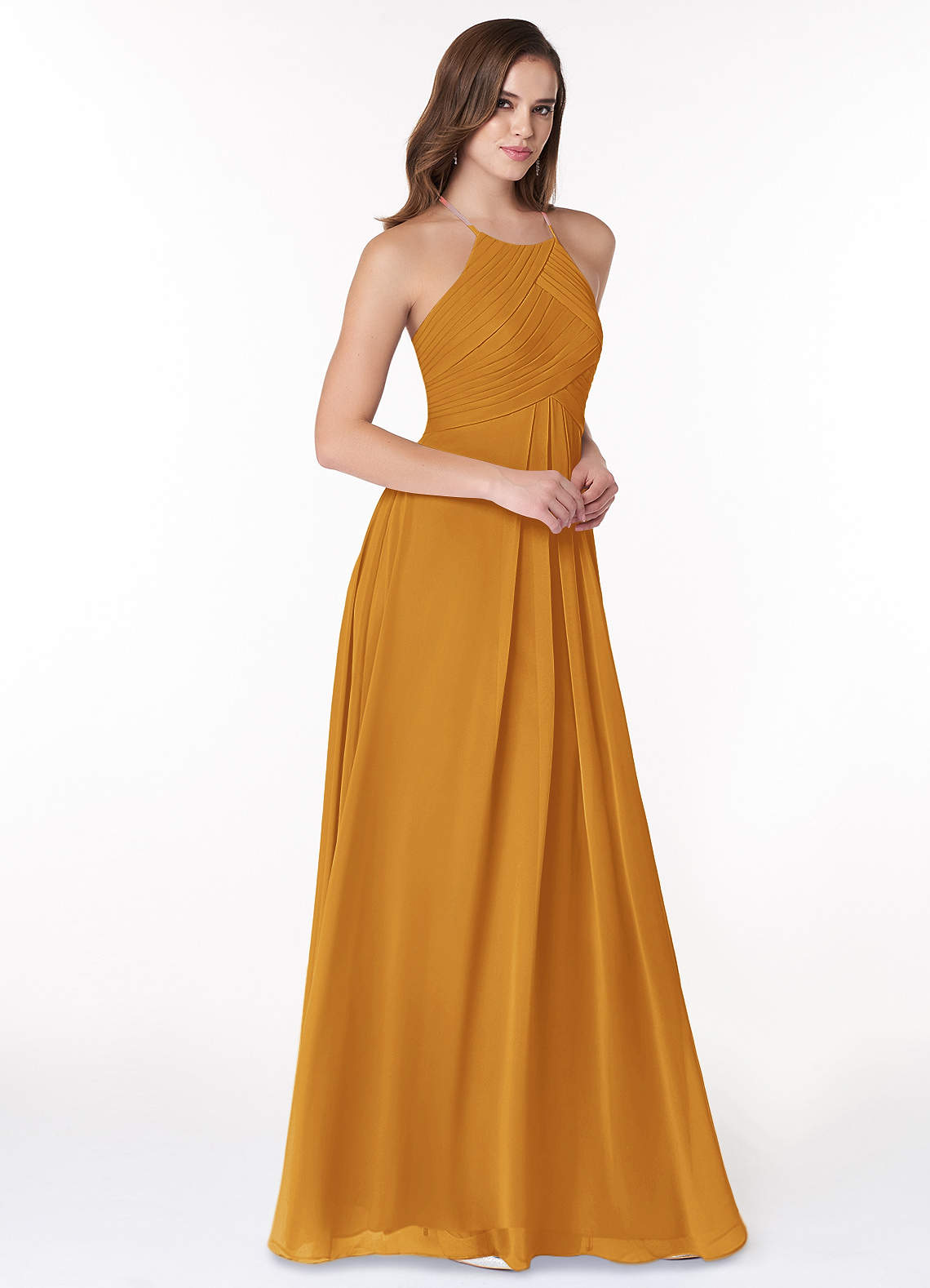 Butterscotch A-Line Halter Pleated Chiffon Dress