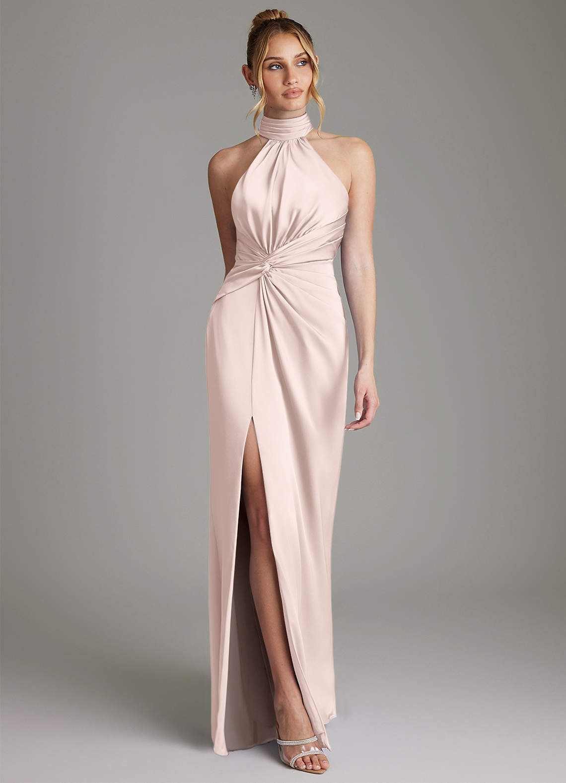 Blushing Pink Sheath Pleated Stretch Satin Dress