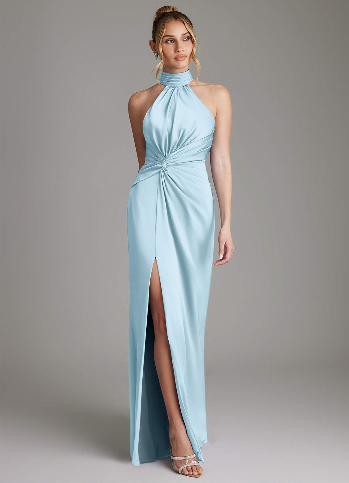 Sky Blue Sheath Pleated Stretch Satin Dress