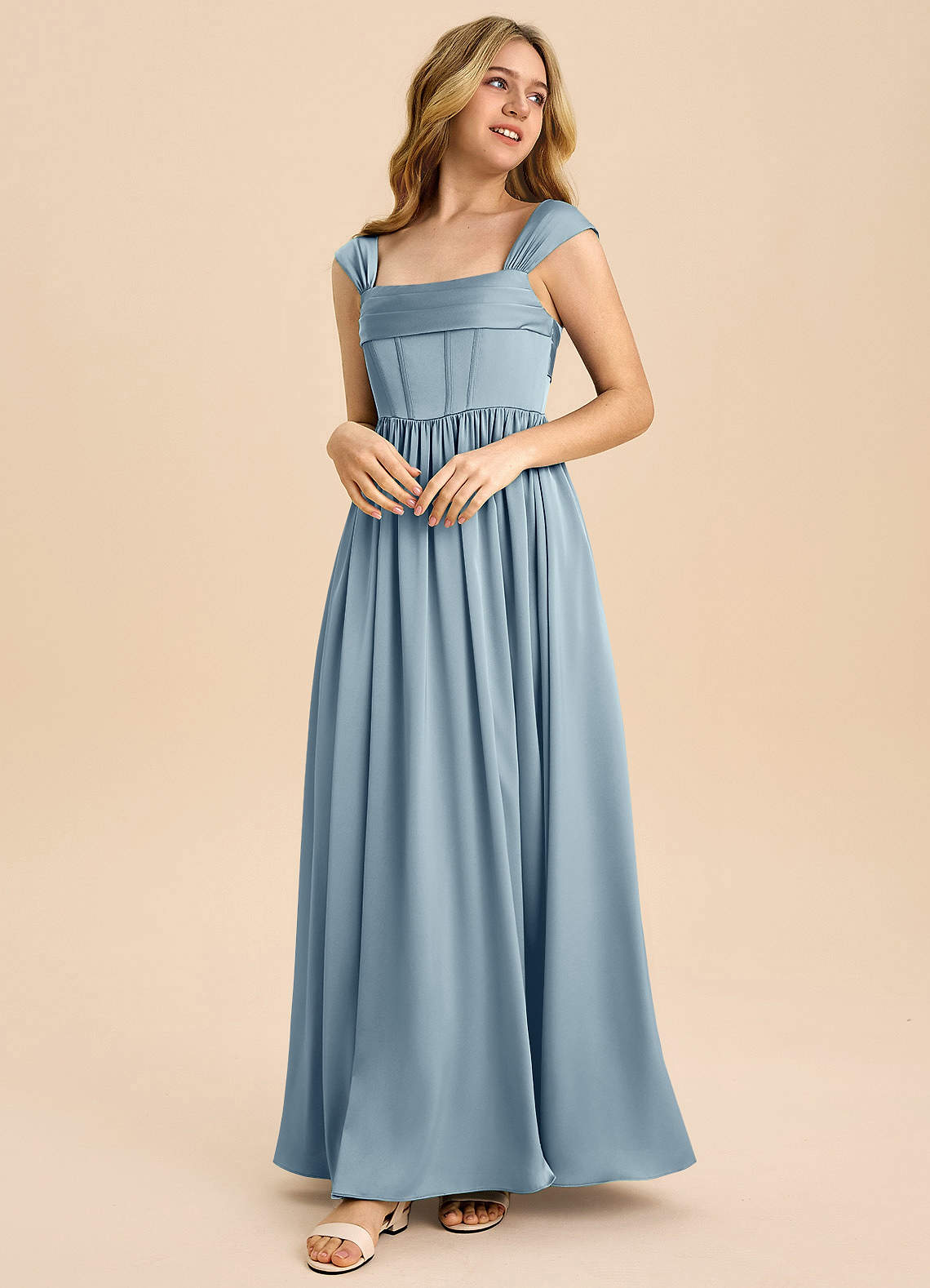 Dusty Blue A-Line Pleated Stretch Satin Dress