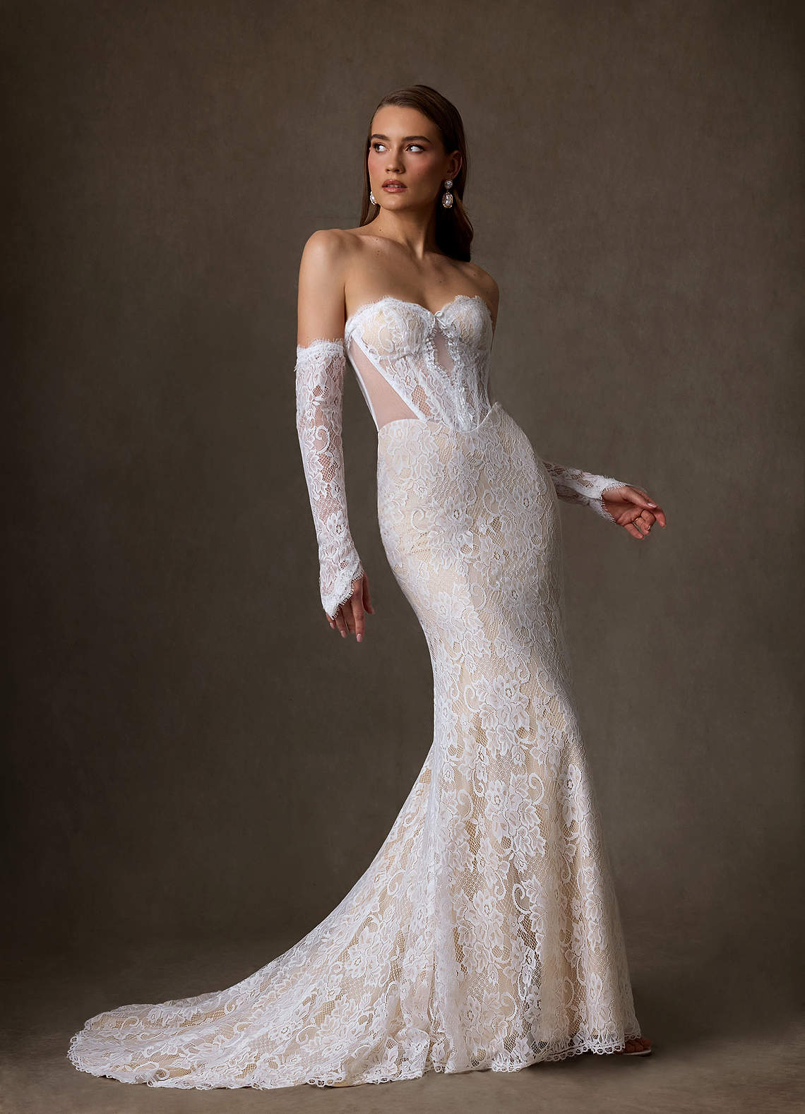 Diamond White Champagne Sheath Strapless Lace Dress