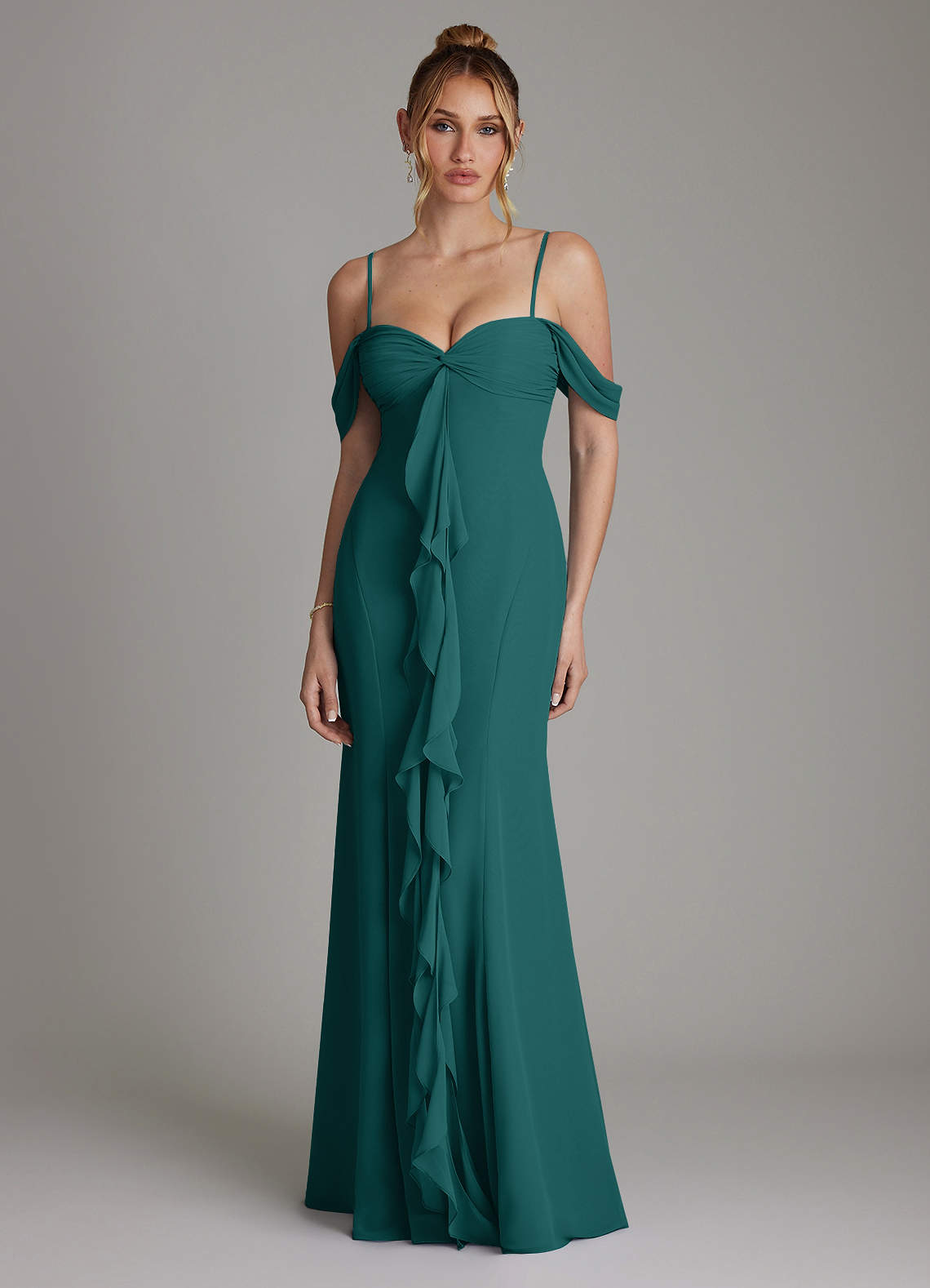 Peacock A-Line Off the Shoulder Chiffon Dress