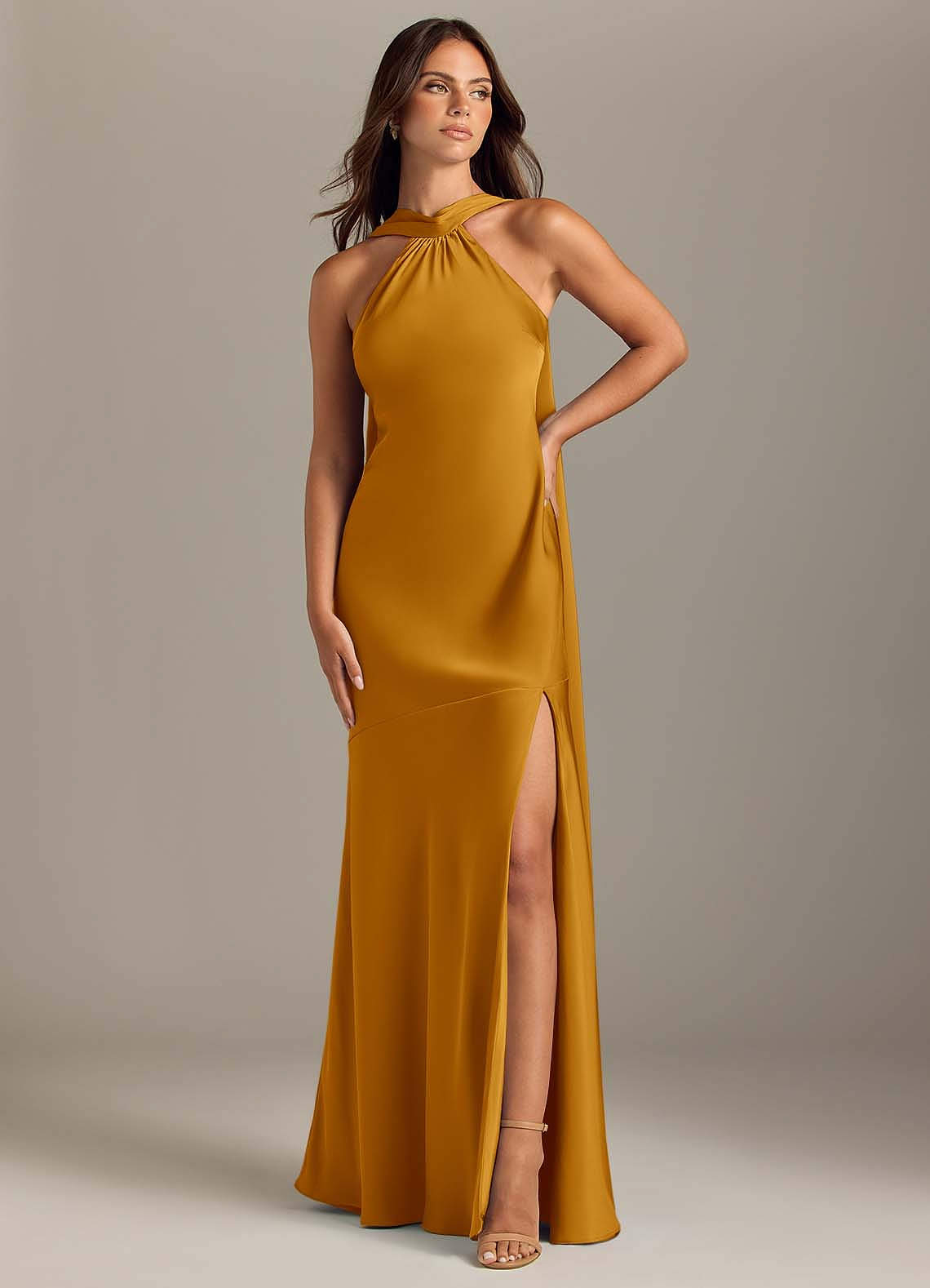 Butterscotch Mermaid Side Slit Stretch Satin Dress