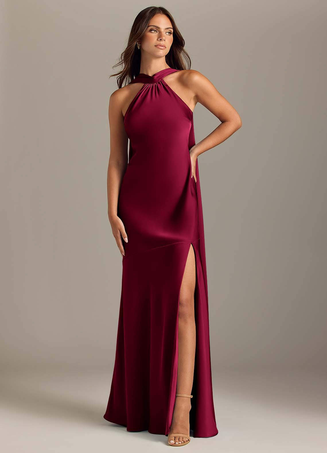 Burgundy Mermaid Side Slit Stretch Satin Dress