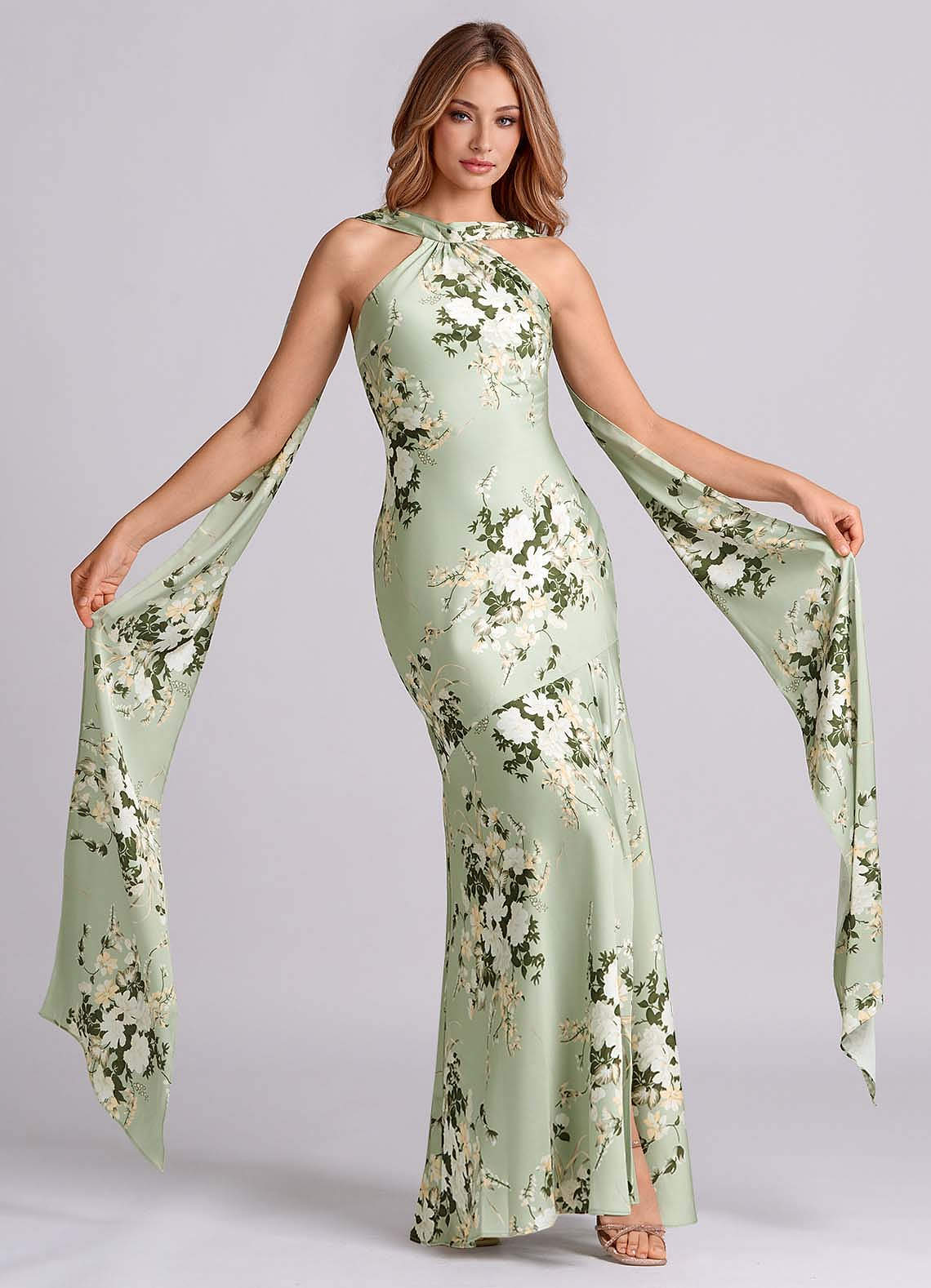 Floral Vines Mermaid Side Slit Stretch Satin Dress