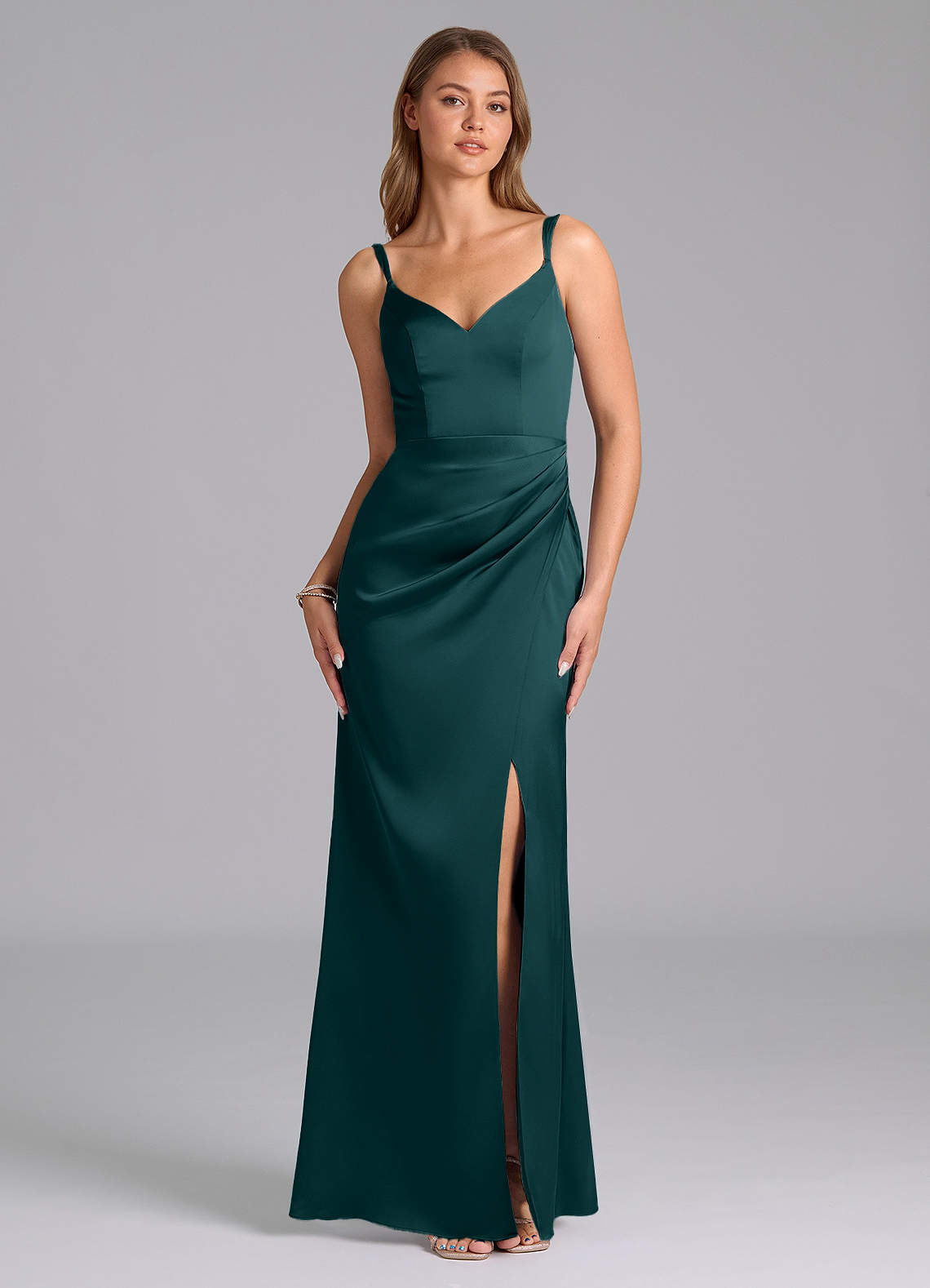 Azazie Leo Final Sale Pine Sheath Pleated Stretch Satin Dress image1