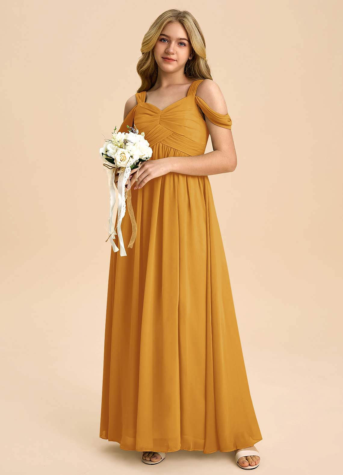 Butterscotch A-Line Off the Shoulder Chiffon Dress