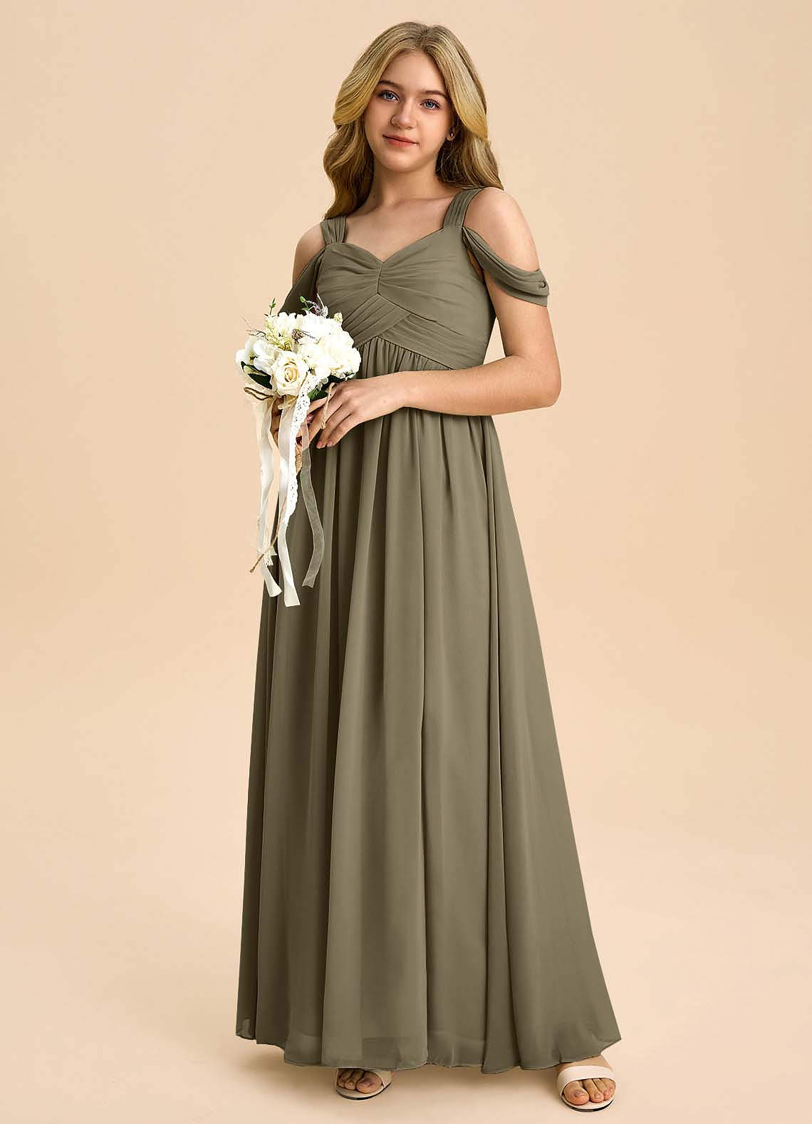 Willow Green A-Line Off the Shoulder Chiffon Dress