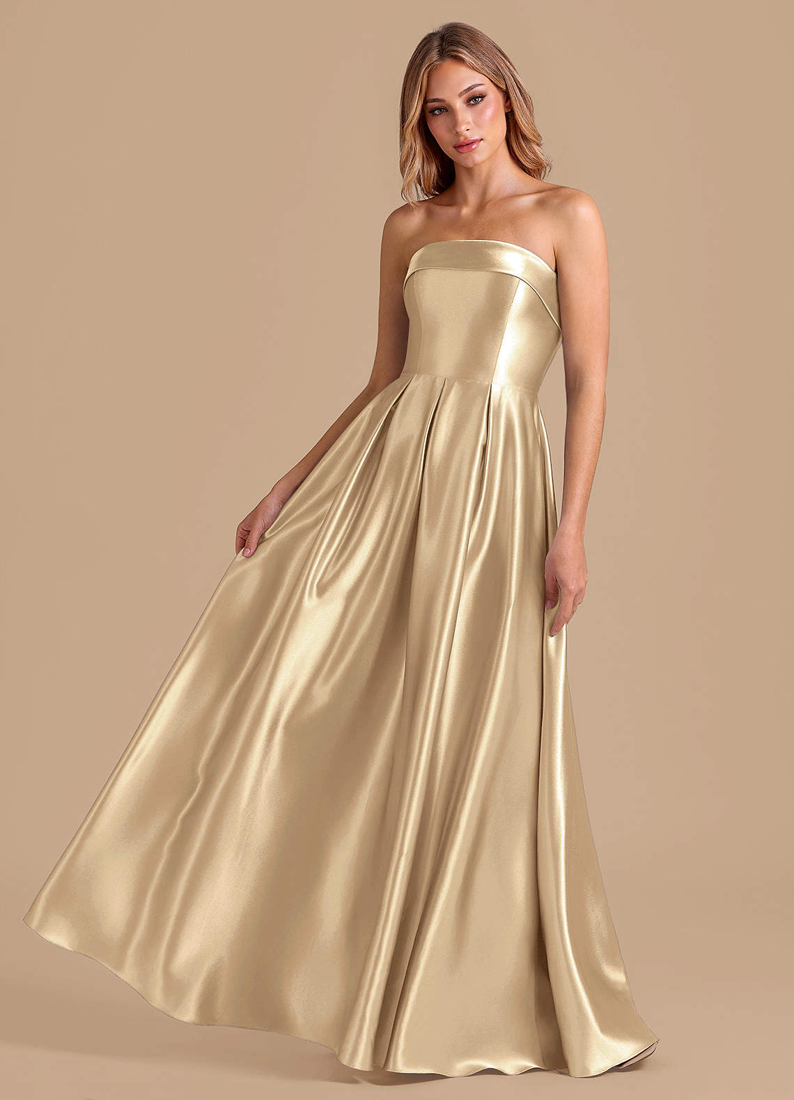 Champagne A-Line Pleated Metallic Satin Dress