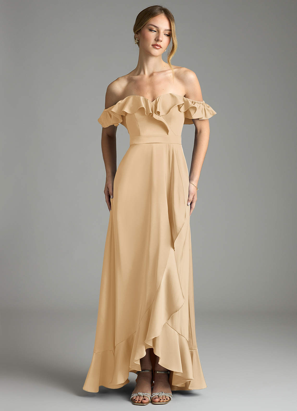 Gold A-Line Off the Shoulder Stretch Satin Convertible Dress