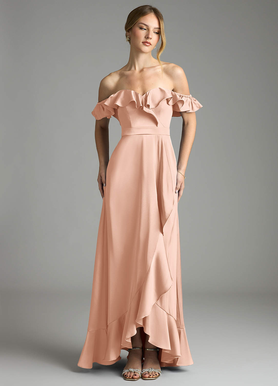 Rose Gold A-Line Off the Shoulder Stretch Satin Convertible Dress