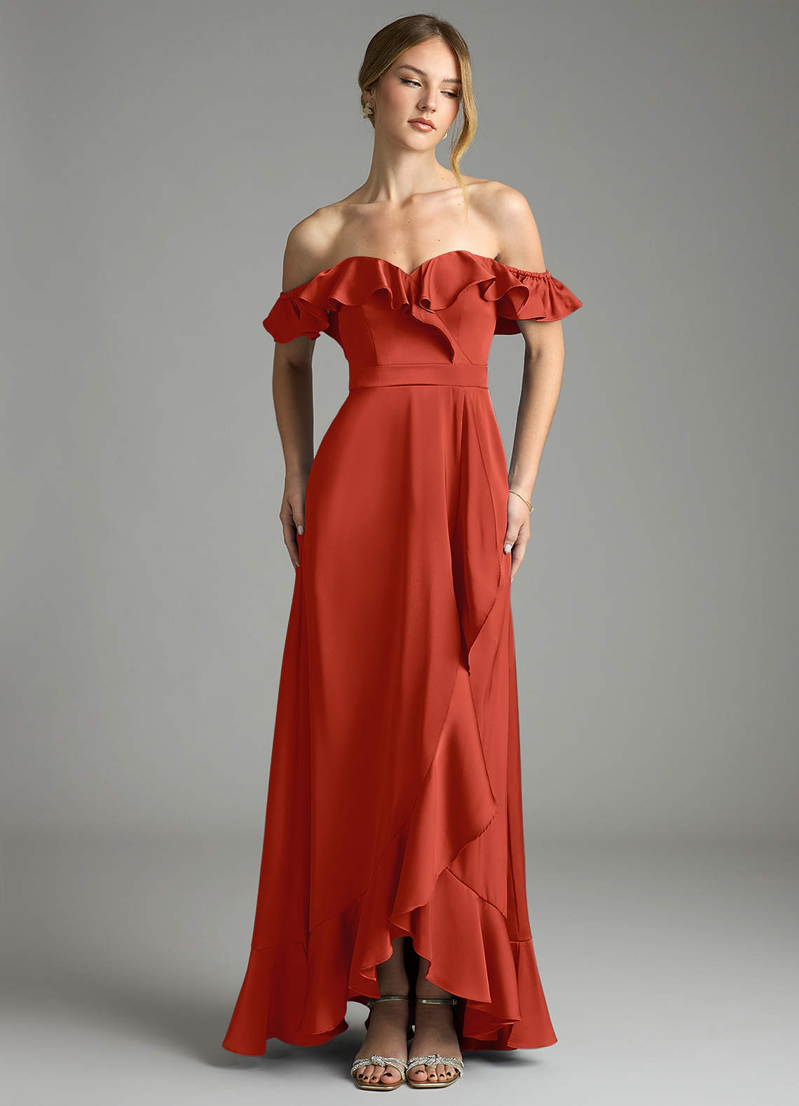 Rust A-Line Off the Shoulder Stretch Satin Convertible Dress