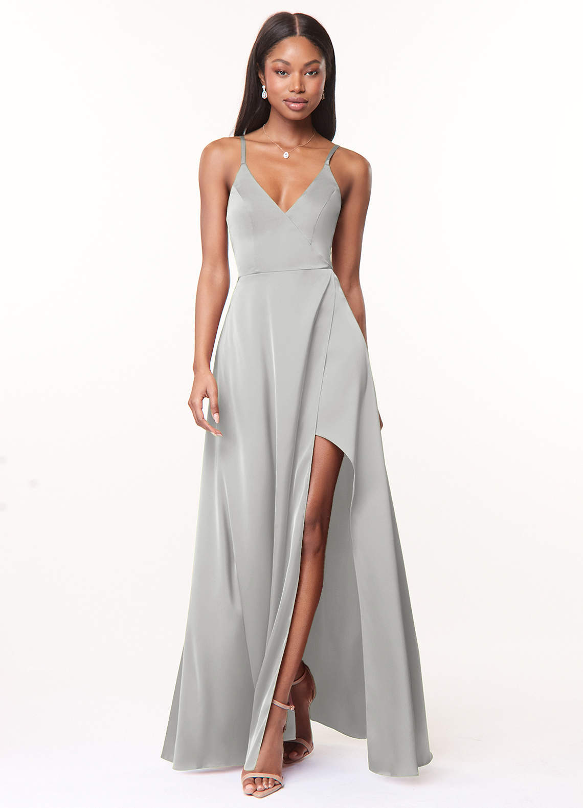 Silver A-Line V-Neck Stretch Satin Dress
