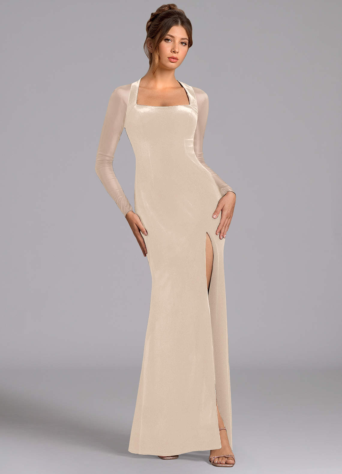 Champagne Mermaid Long Sleeve Mesh Dress