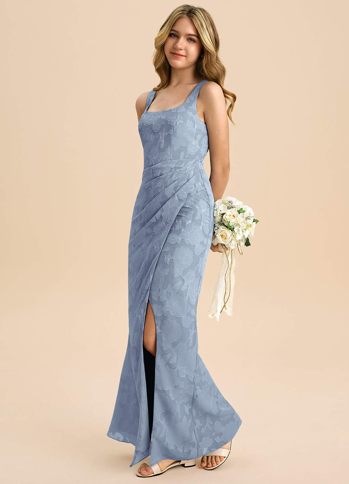 Dusty Blue Sheath Pleated Floral Burnout Dress