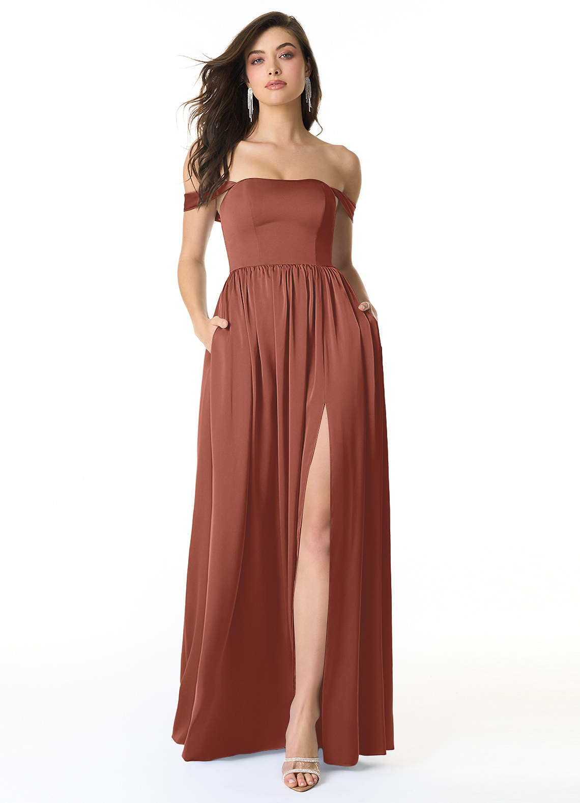 Auburn A-Line Off the Shoulder Stretch Satin Convertible Dress