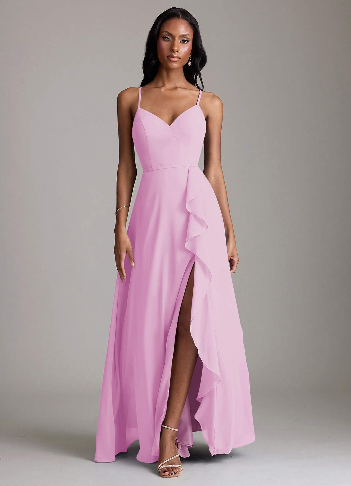 Candy Pink A-Line V-Neck Ruffle Chiffon Dress
