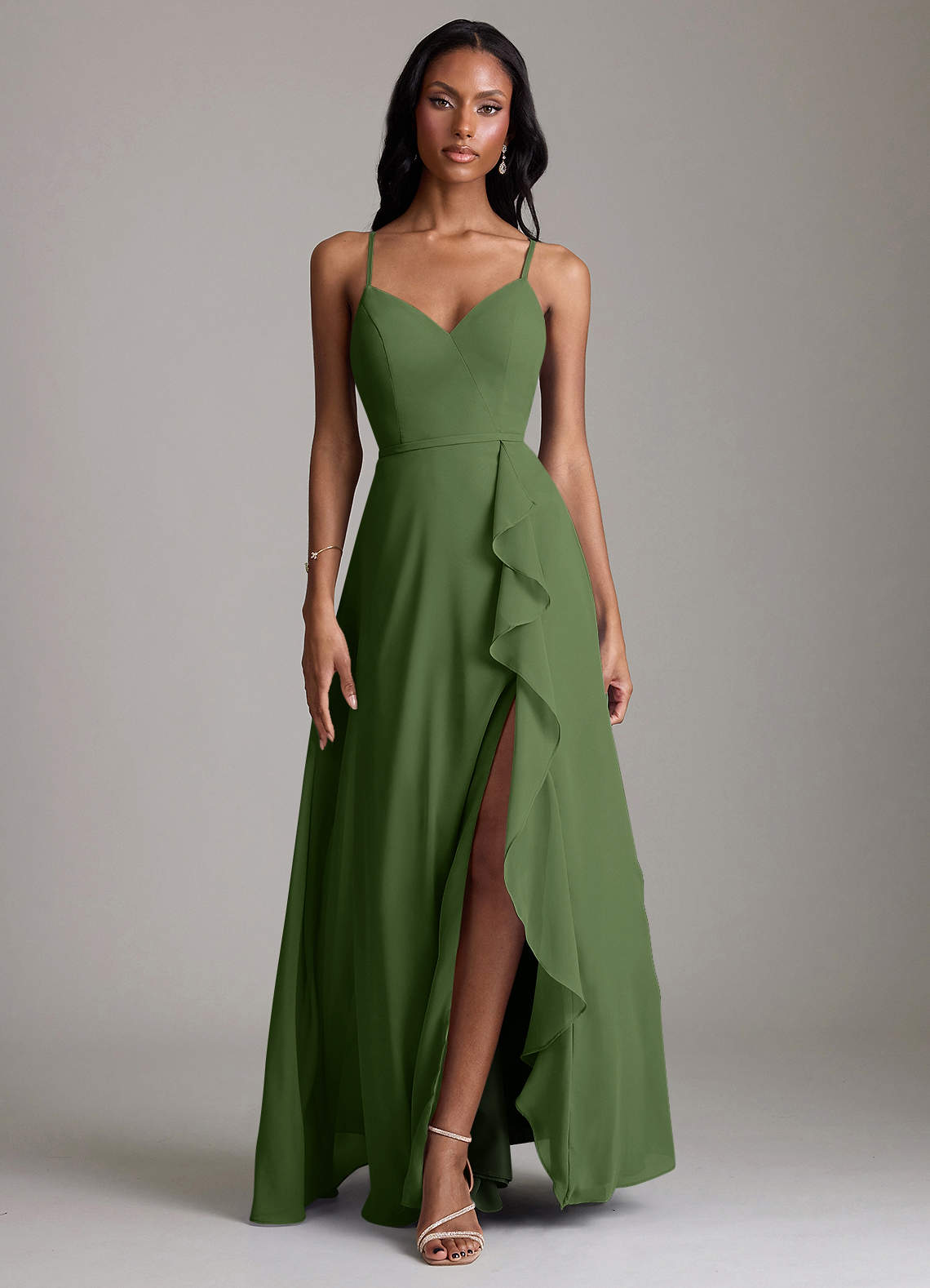 Olive A-Line V-Neck Ruffle Chiffon Dress