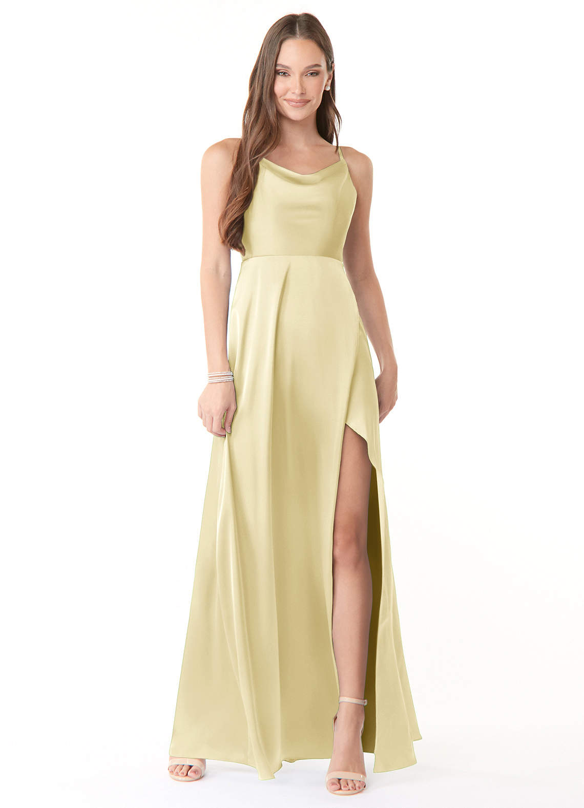 Lemon Sorbet A-Line Cowl Neckline Side Slit Stretch Satin Dress