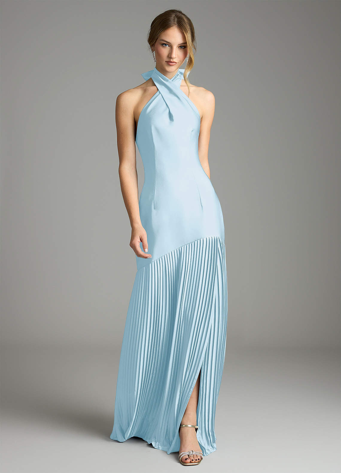 Sky Blue A-Line Pleated Stretch Satin Dress