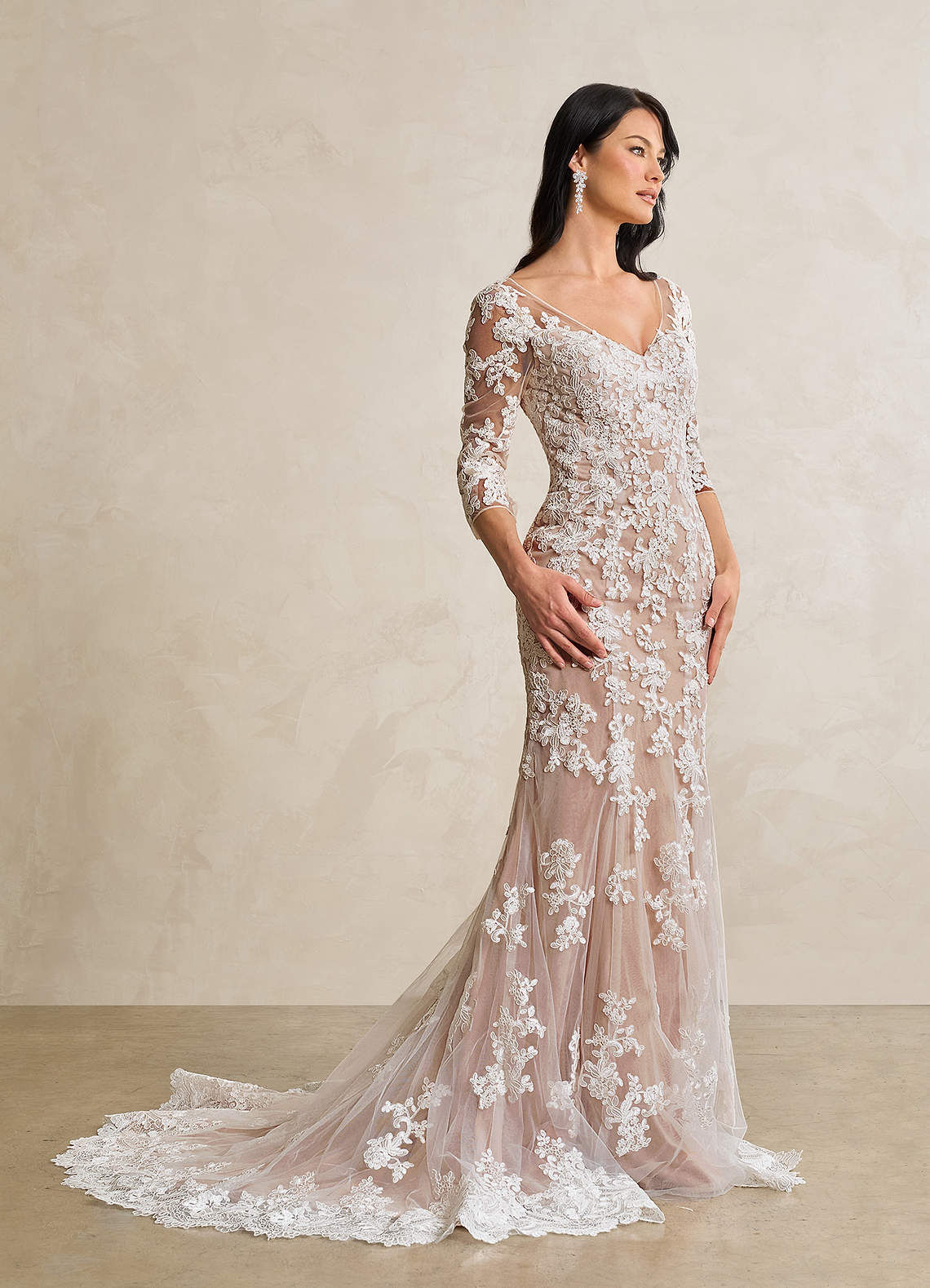 Diamond White Mocha Mermaid V-Neck Lace Tulle Dress