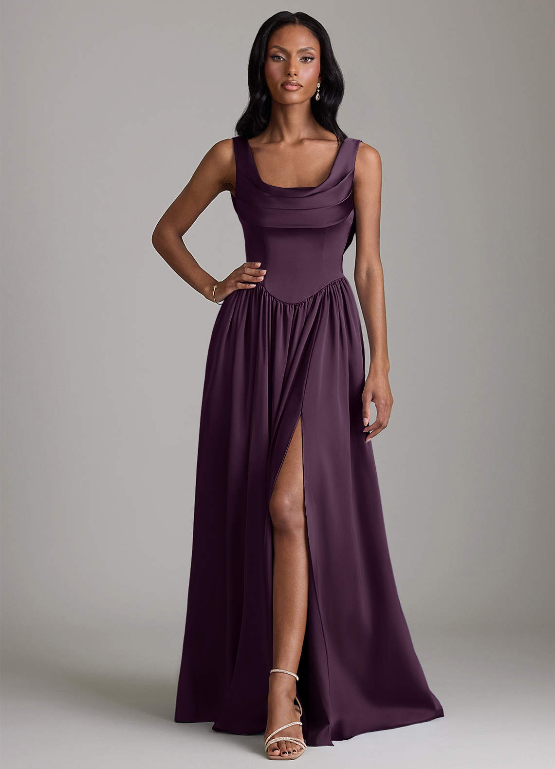 Azazie Novi Bridesmaid Dresses Plum A-Line with Pockets Stretch Satin Dress image1