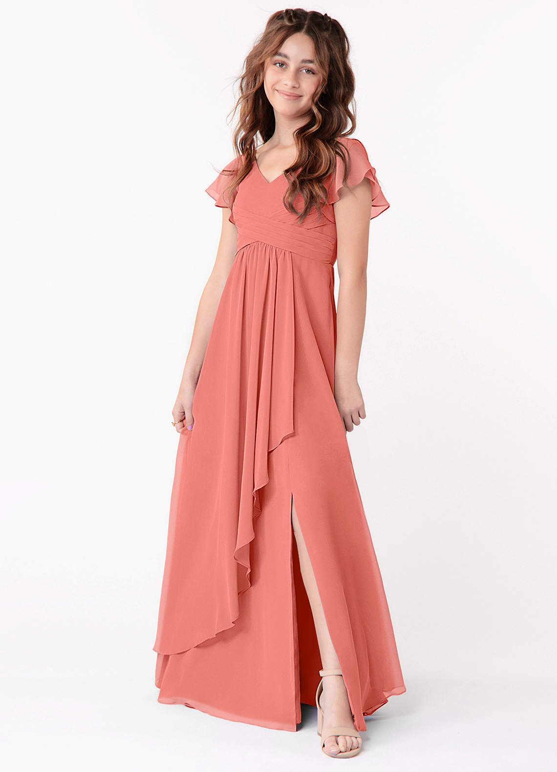 Salmon Pink A-Line Ruched Chiffon Dress