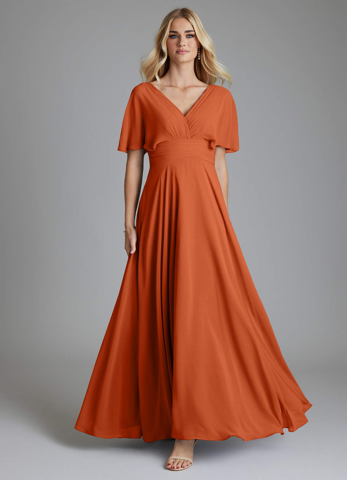 Burnt Orange A-Line V-Neck Pleated Chiffon Dress