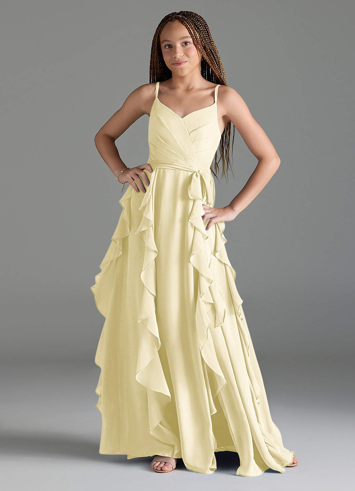 Lemon Sorbet A-Line V-Neck Cascading Ruffles Chiffon Dress