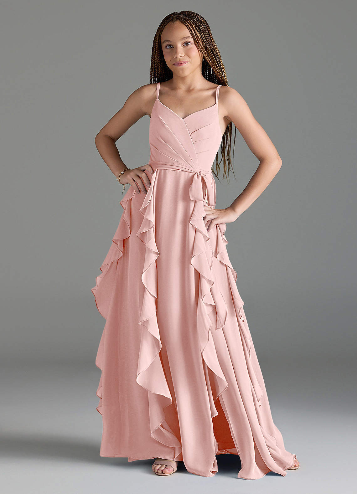 Powder Pink A-Line V-Neck Cascading Ruffles Chiffon Dress