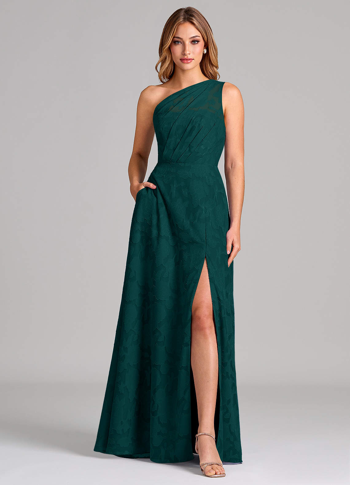 Azazie Phaedra Bridesmaid Dresses Pine A-Line One Shoulder Floral Burnout Dress image1
