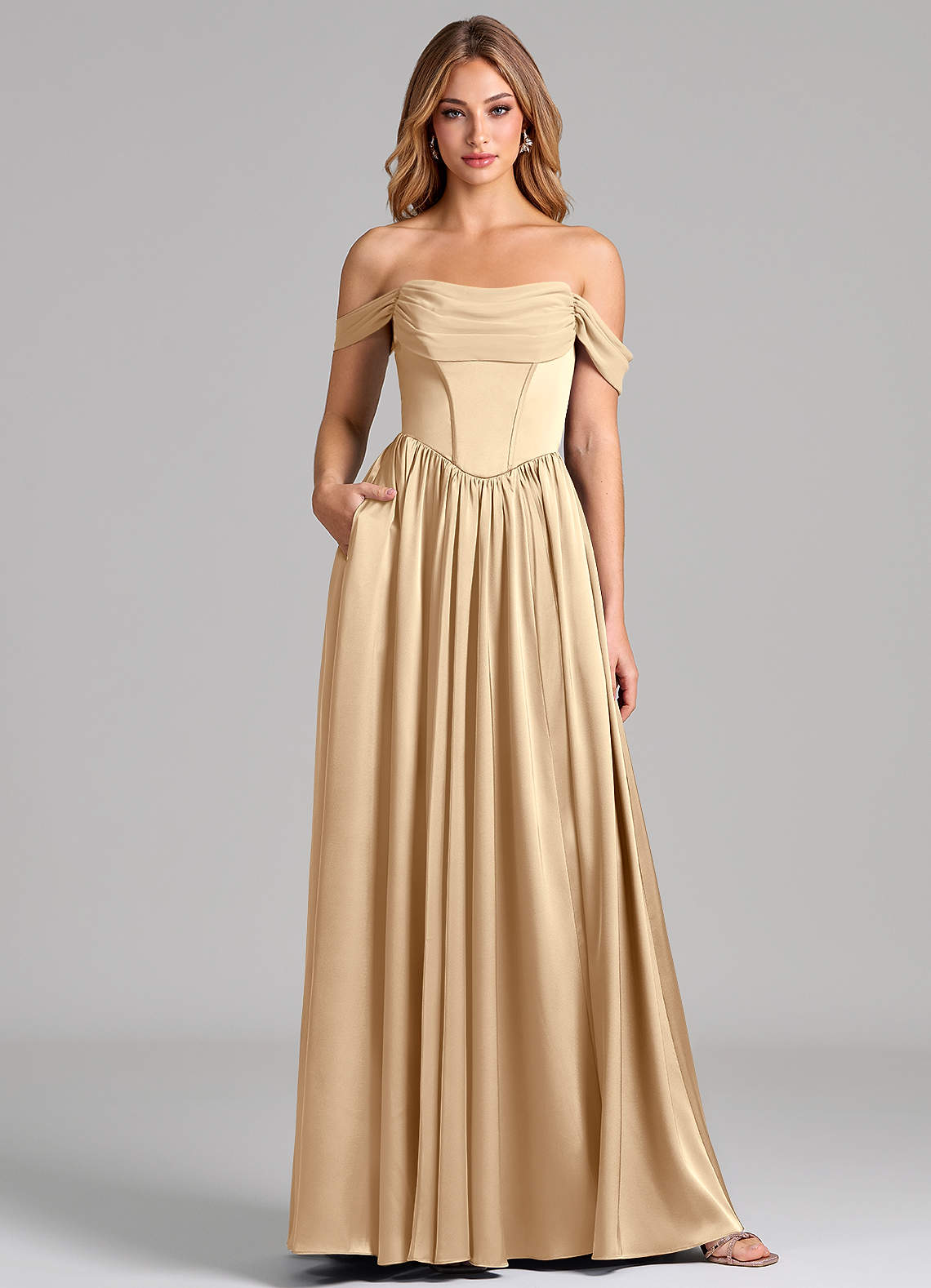 Champagne A-Line Off the Shoulder Stretch Satin Dress