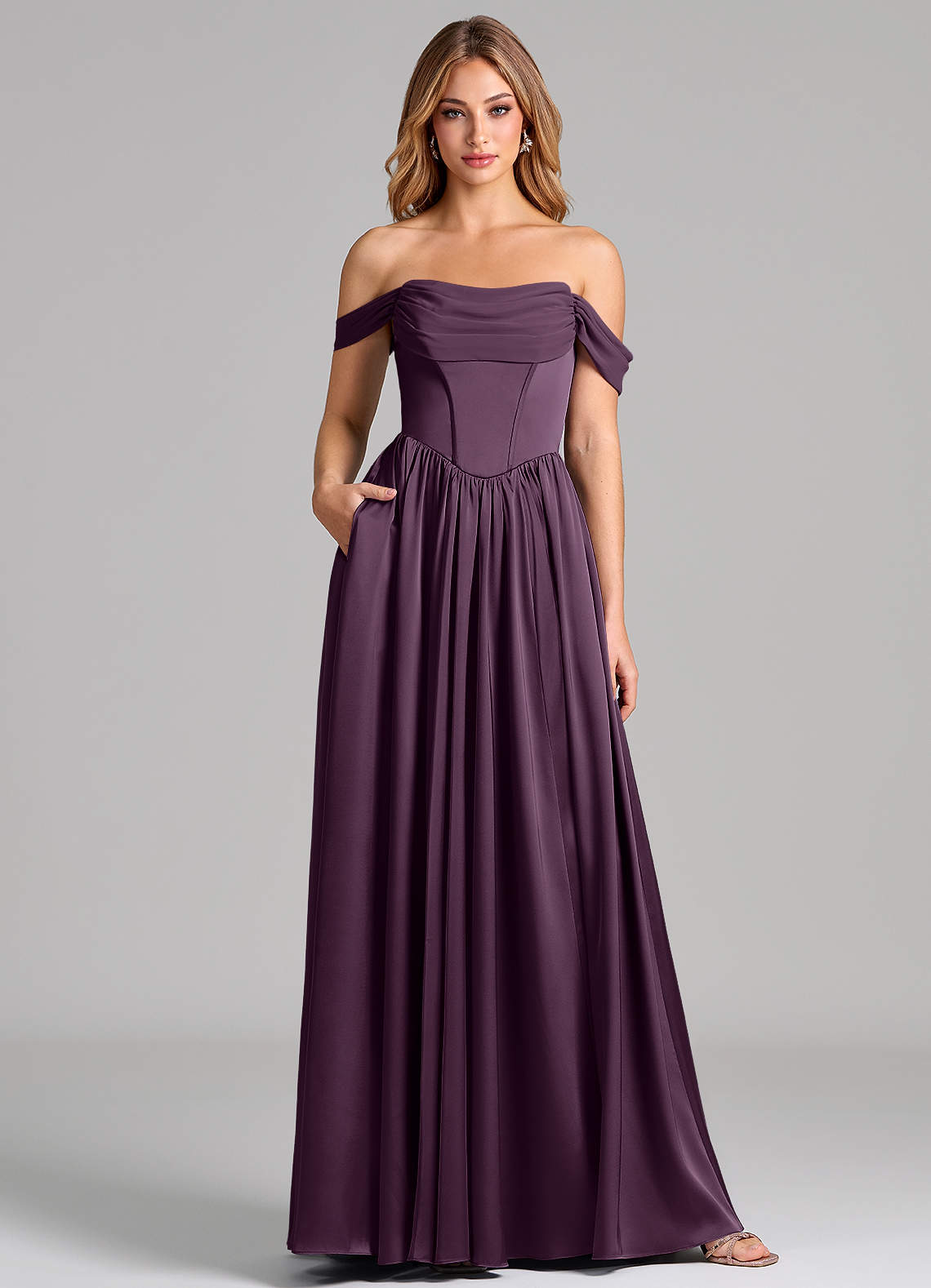 Plum A-Line Off the Shoulder Stretch Satin Dress