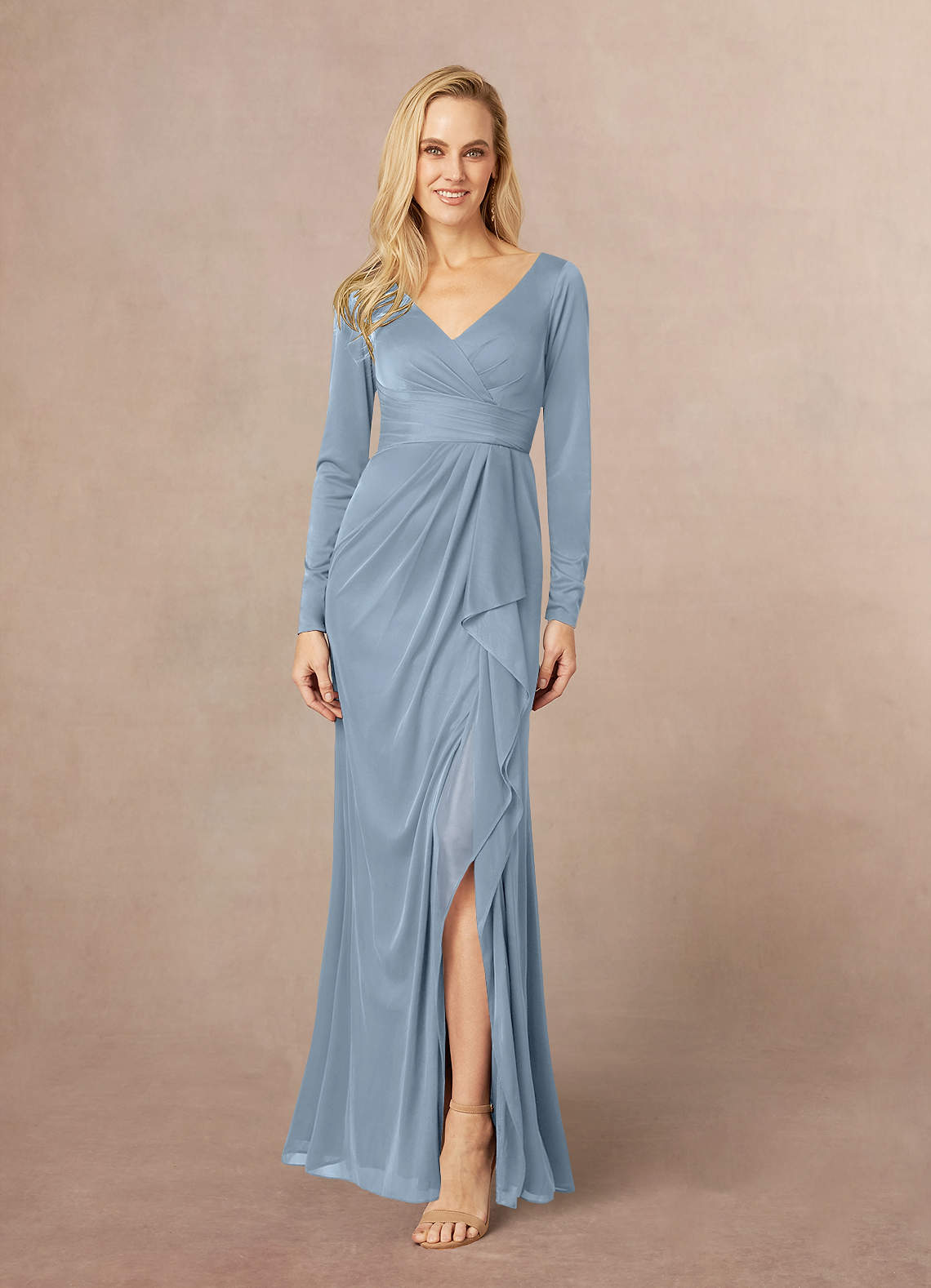 Dusty Blue Mermaid V-Neck Pleated Mesh Dress
