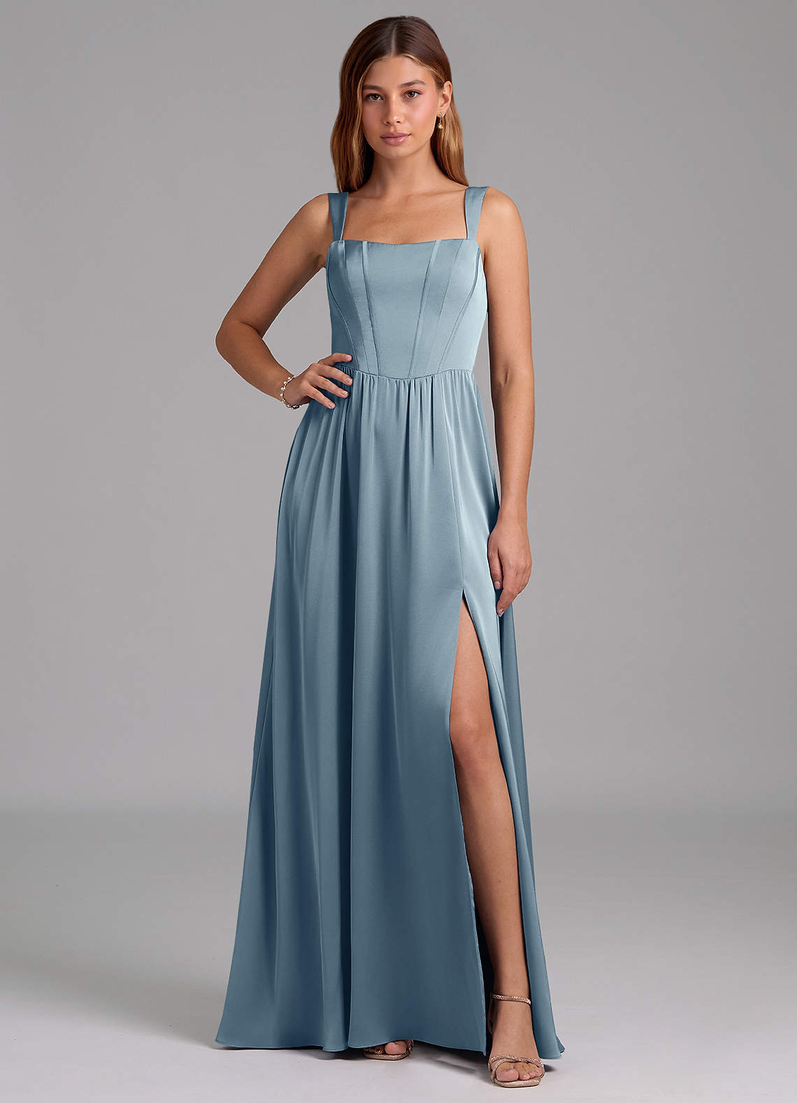 Dusty Blue A-Line Side Slit Stretch Satin Dress