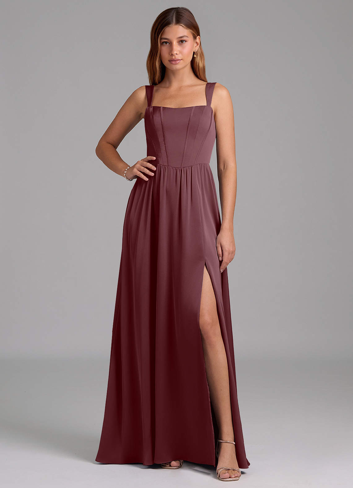 Sangria A-Line Side Slit Stretch Satin Dress