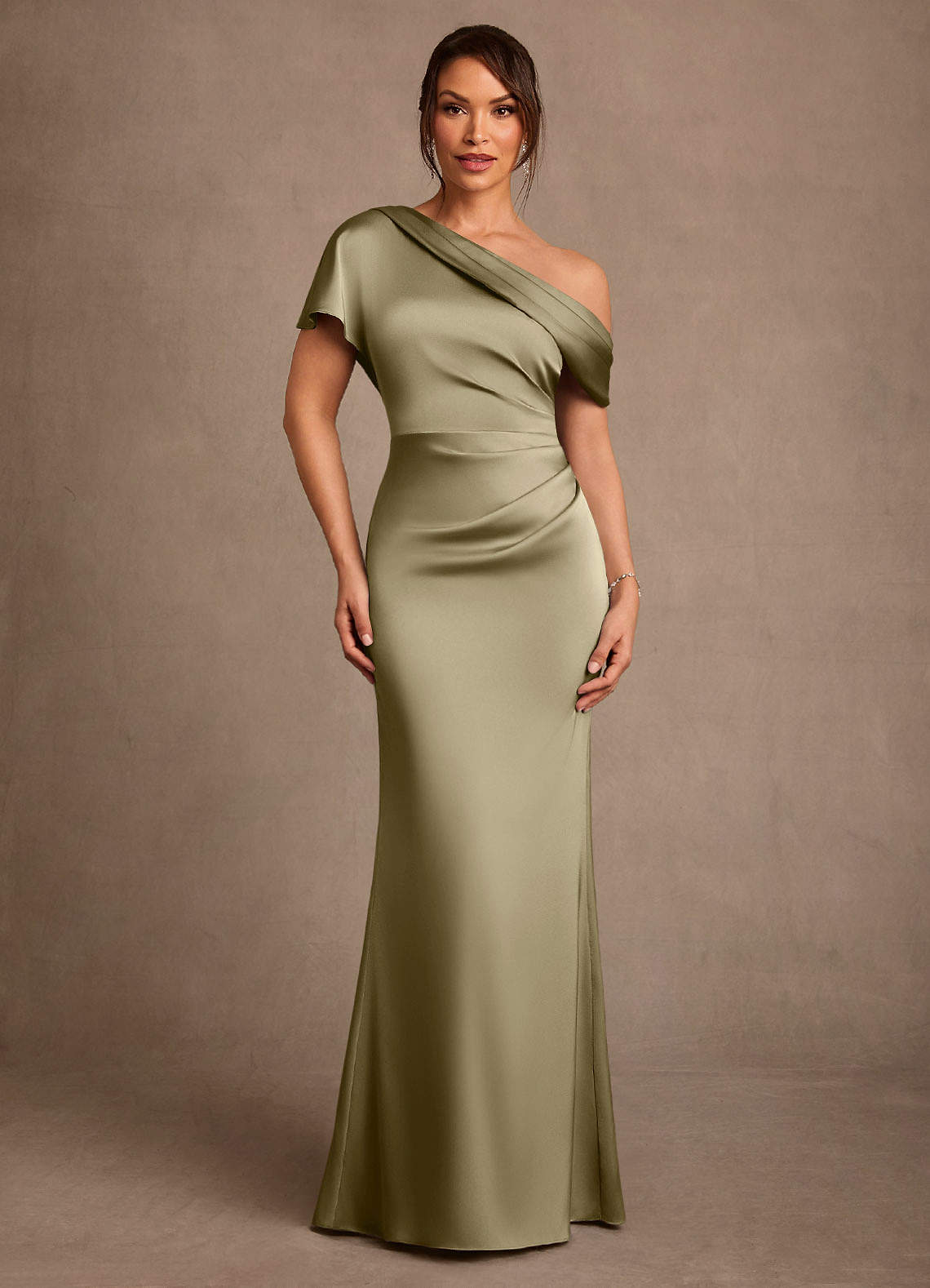 Moss Green Sheath One Shoulder Stretch Satin Dress