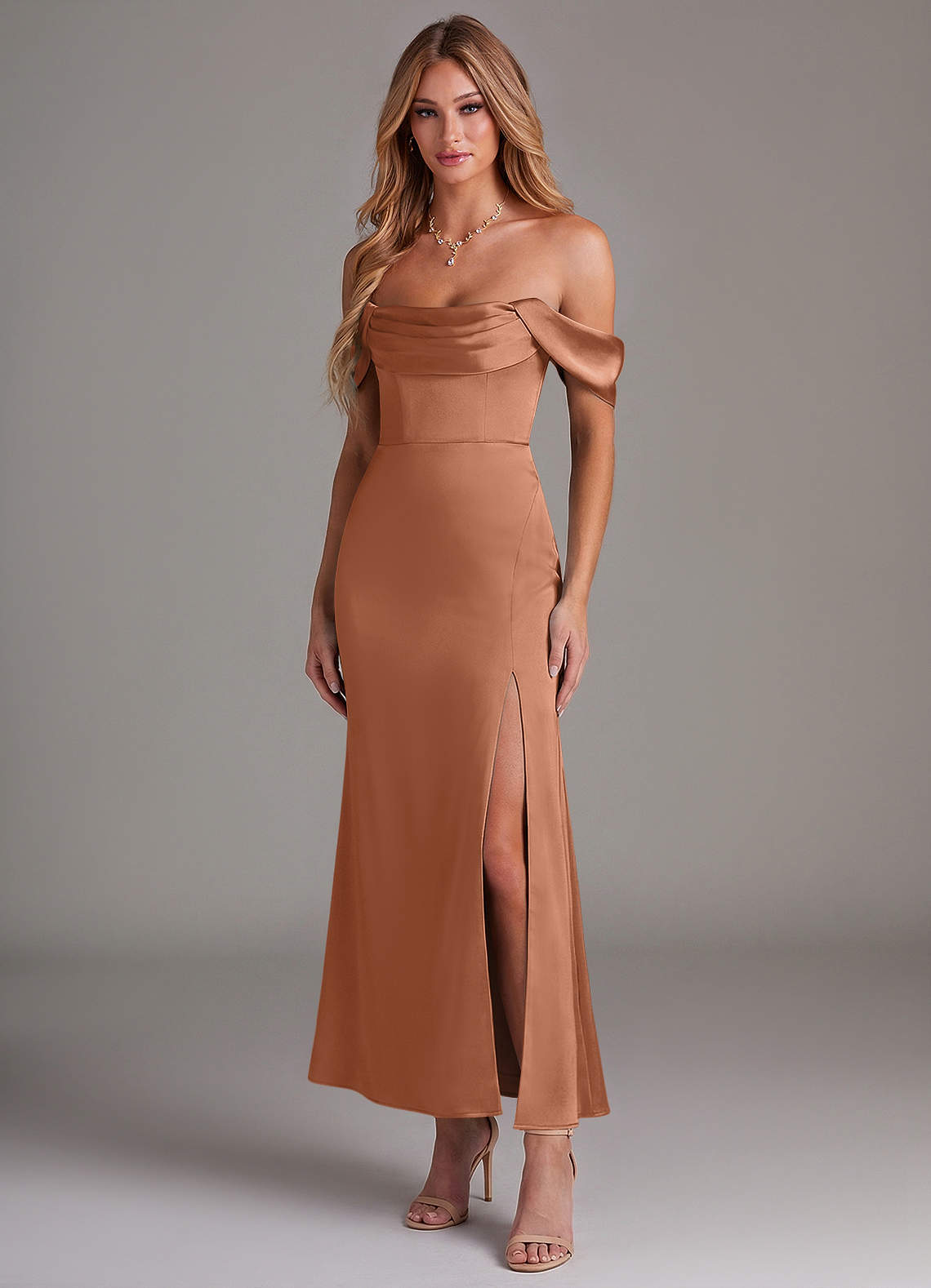 Bronzer Mermaid Off the Shoulder Stretch Satin Dress