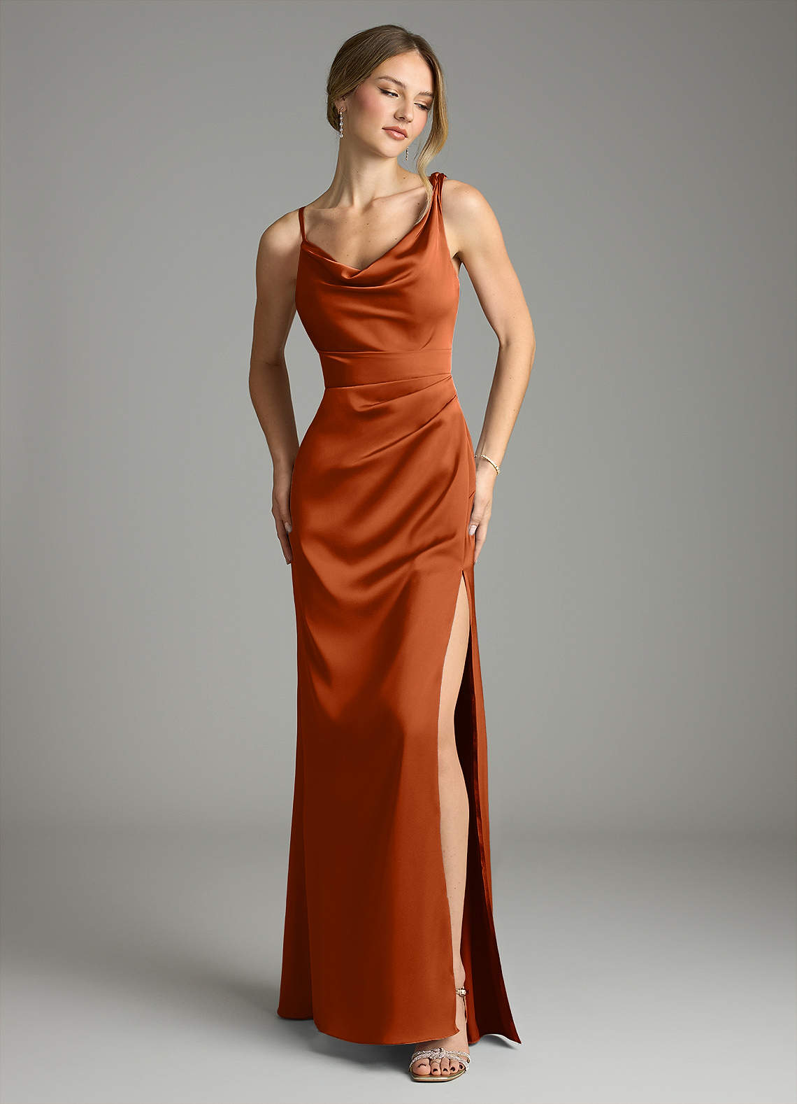 Burnt Orange Mermaid Pleated Stretch Satin Dress