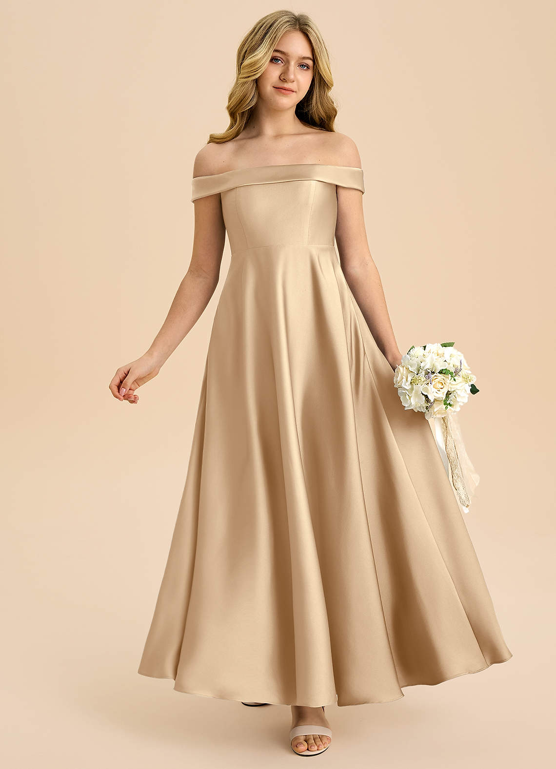 Champagne A-Line Off the Shoulder Stretch Satin Dress