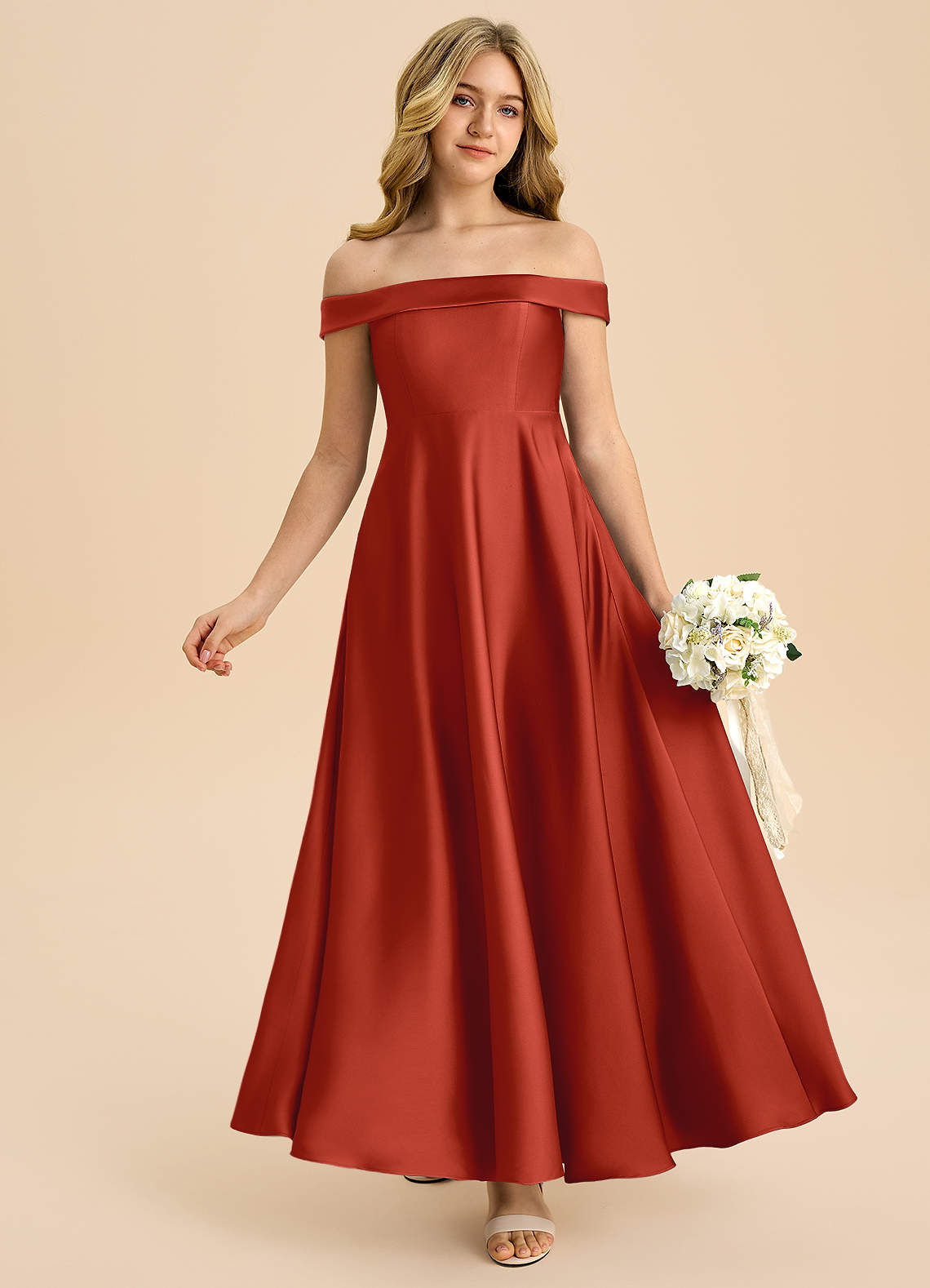 Rust A-Line Off the Shoulder Stretch Satin Dress