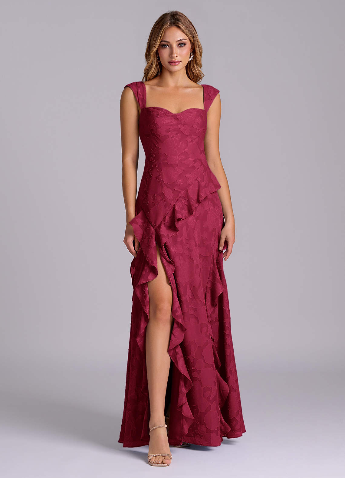 Burgundy A-Line Sweetheart Neckline Floral Burnout Dress