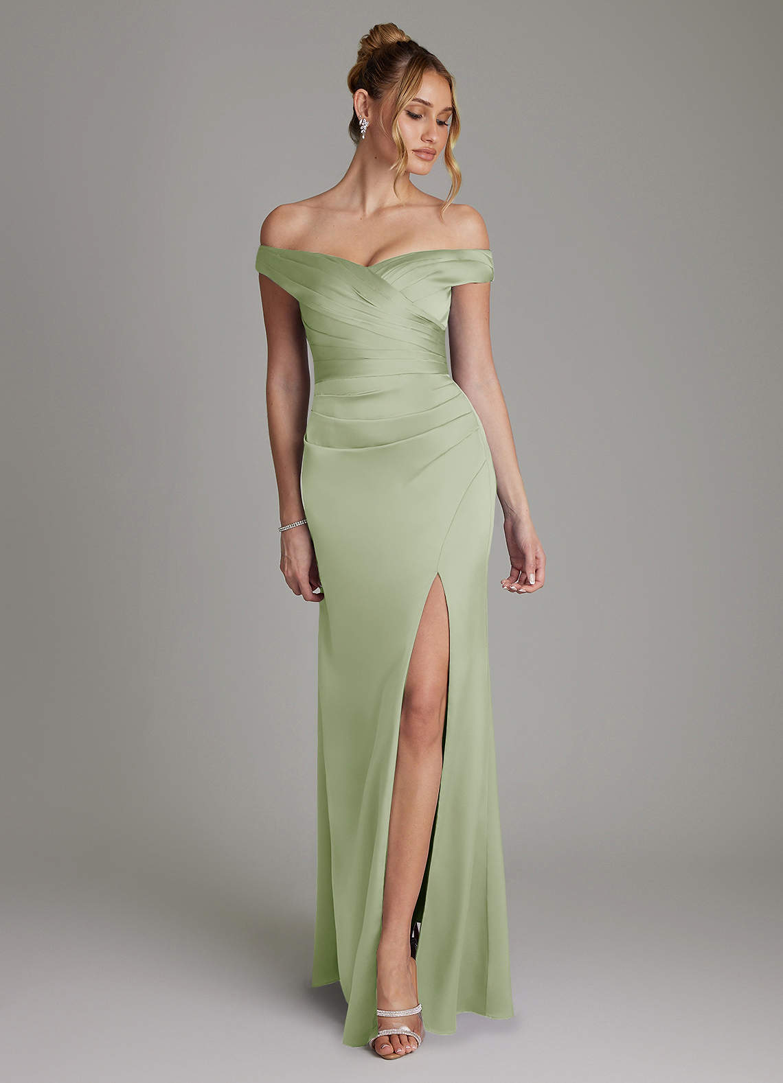 Dusty Sage Sheath Off the Shoulder Stretch Satin Dress